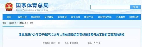 體育總局辦公廳關于做好2018年大型體育場館免費或低收費開放工作有關事宜的通知